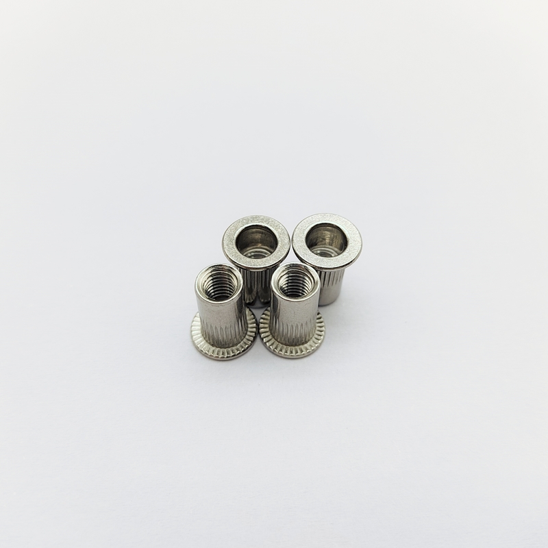 Đai ốc tán chống xoay với đầu phẳng & khía dọc. Thép không gỉ 304, thân bán nhẵn, ren trong một phần. Kích thước M4-M8. Đã xử lý thụ động. Lý tưởng cho điện tử & vỏ bọc.